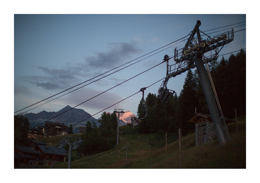 Ce n’est plus vraiment l’été et pas encore l’hiver. Ce sont ces quelques jours de transition que les saisonniers, touristes et autres humains ont choisi pour déserter les stations d’altitudes. On a le sentiment que quelqu’un a appuyé sur pause, tout en laissant la nature se mouvoir. Les ruisseaux continuent de couler, les nuages de voyager ou encore la luminosité de changer. Seul quelques ouvriers demeurent, sans doute chargés de réparer deux ou trois bricoles, avant le retour de la civilisation. Cette ambiance où le temps s’est arrêté est éphémère : les moteurs des touristes grondent déjà au fond de la vallée.