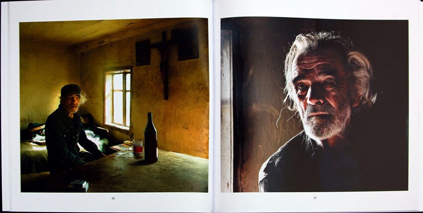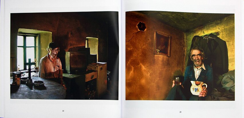 The photographer was attracted by the lonely house, its unusual inhabitant, his face carved by decades, modest, sooting inside colored oddly beautiful in the small windows’ dim light. Over a gradual developing of bonds, images arose into which we now, as they are before us, so many meanings, gliding over objects with gaze, making out ethnological particularities, familiarizing ourselves with the old man's solitude and asking ourselves about the social extensions of his living conditions. But, if for a moment we look beyond the objective reality, quiet inner worlds reveal themselves, in which impressions are more important than meaning, and colors and shapes more succulent than words...